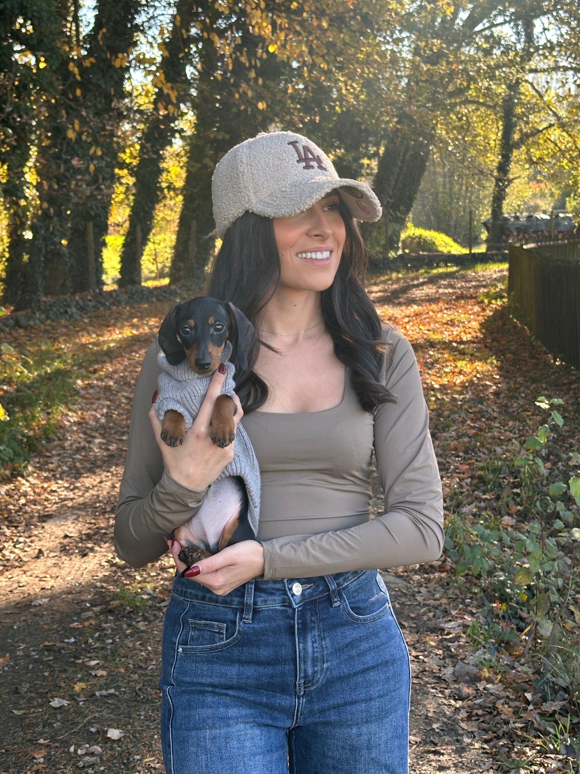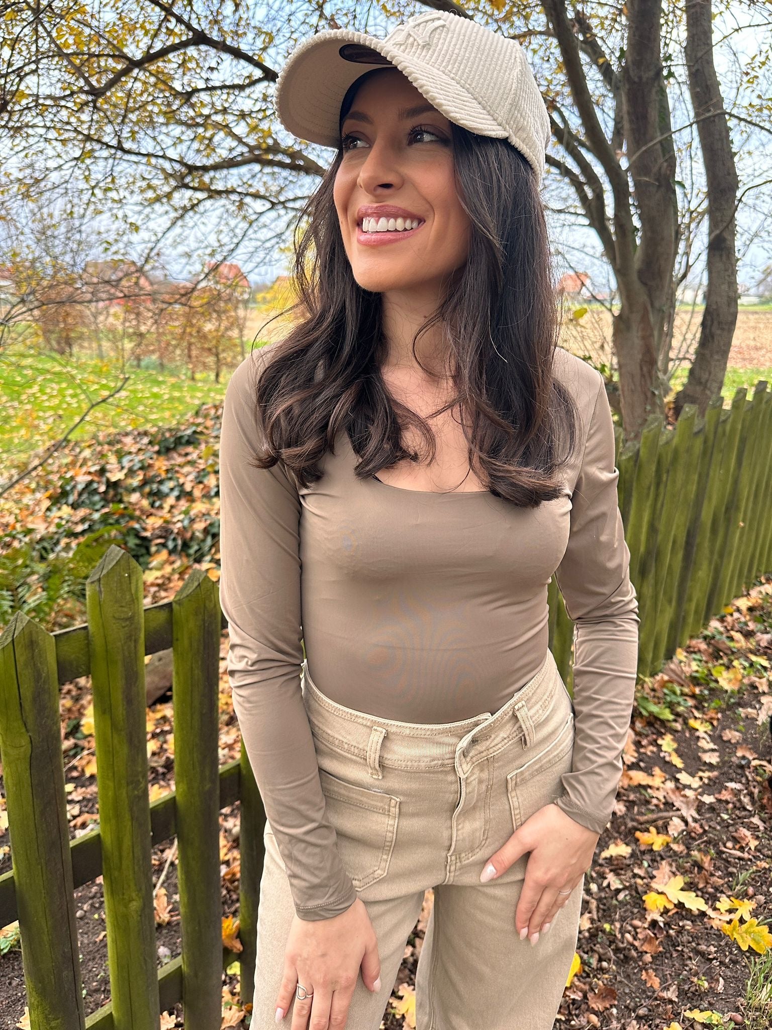 CAPRI taupe - Body col carré, manches longues, effet seconde peau.