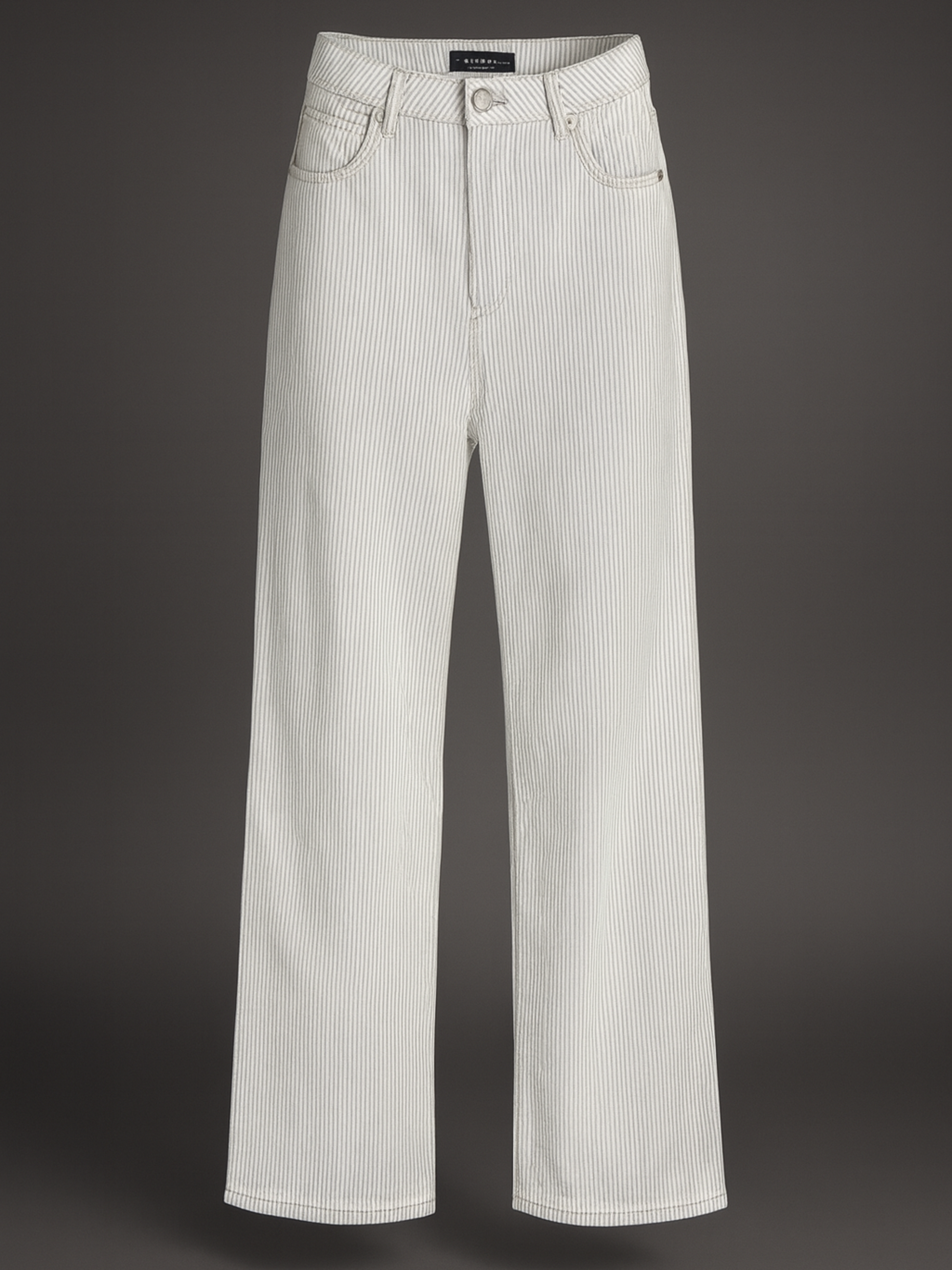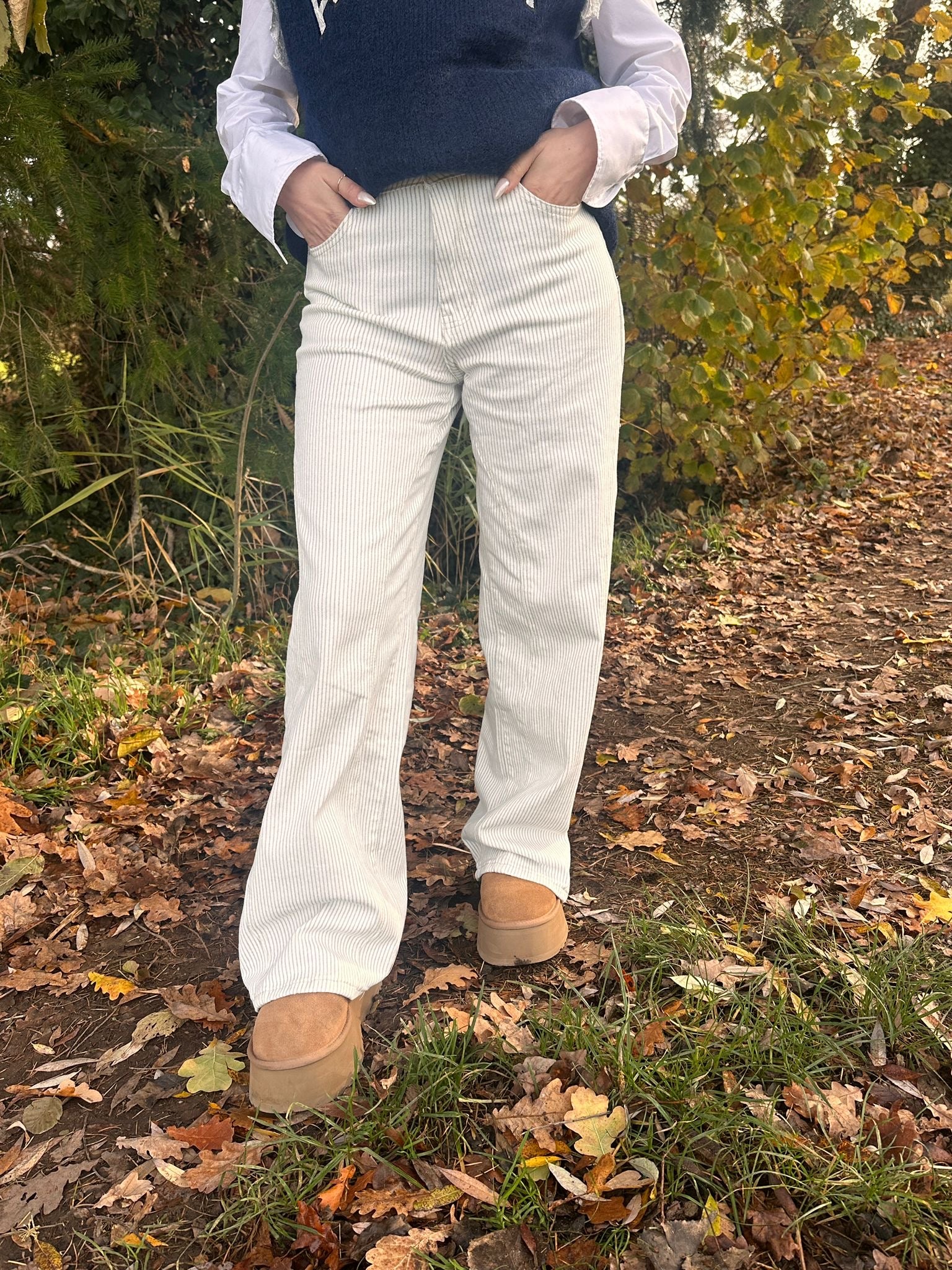 Pantalon large blanc à rayures. Le pantalon parfait pour un look chic et décontracté à la fois. Ce pantalon blanc à fines rayures grises mise sur une coupe wide leg fluide qui allonge la silhouette et assure un tombé élégant. Confortable grâce à sa composition en coton légèrement stretch, il se porte aussi bien avec des baskets pour un look casual que des talons pour une allure plus habillée.