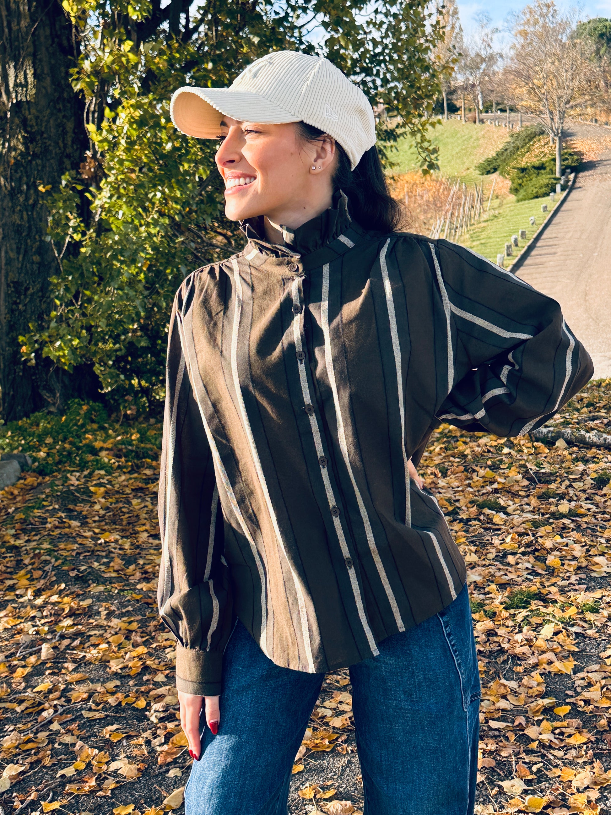 La VERONA est la chemise casual-chic par excellence. Avec sa coupe ample, son col structuré et ses rayures verticales élégantes, elle allonge la silhouette tout en offrant un style moderne et effortless. Confectionnée en 100% coton, elle est douce, respirante et ultra agréable à porter au quotidien. Son coloris kaki rayé gris et blanc lui donne un charme urbain et tendance, parfait pour des looks mi-saison. Une pièce versatile, aussi belle portée rentré que loose, ouverte sur un top ou boutonnée jusqu'en haut.